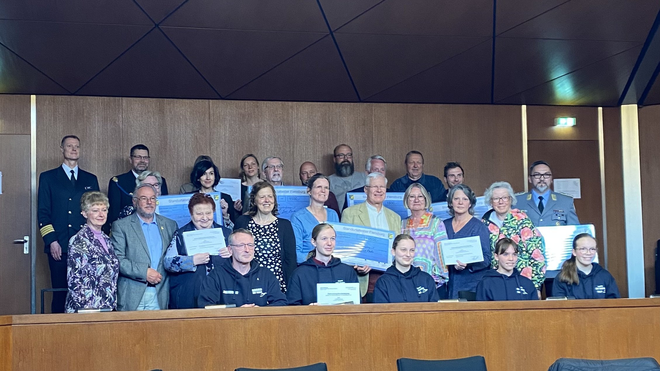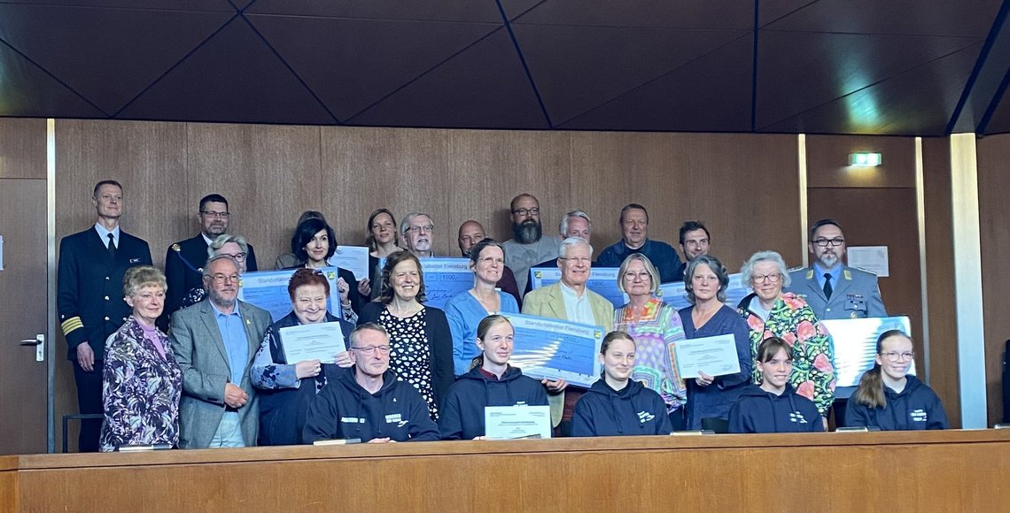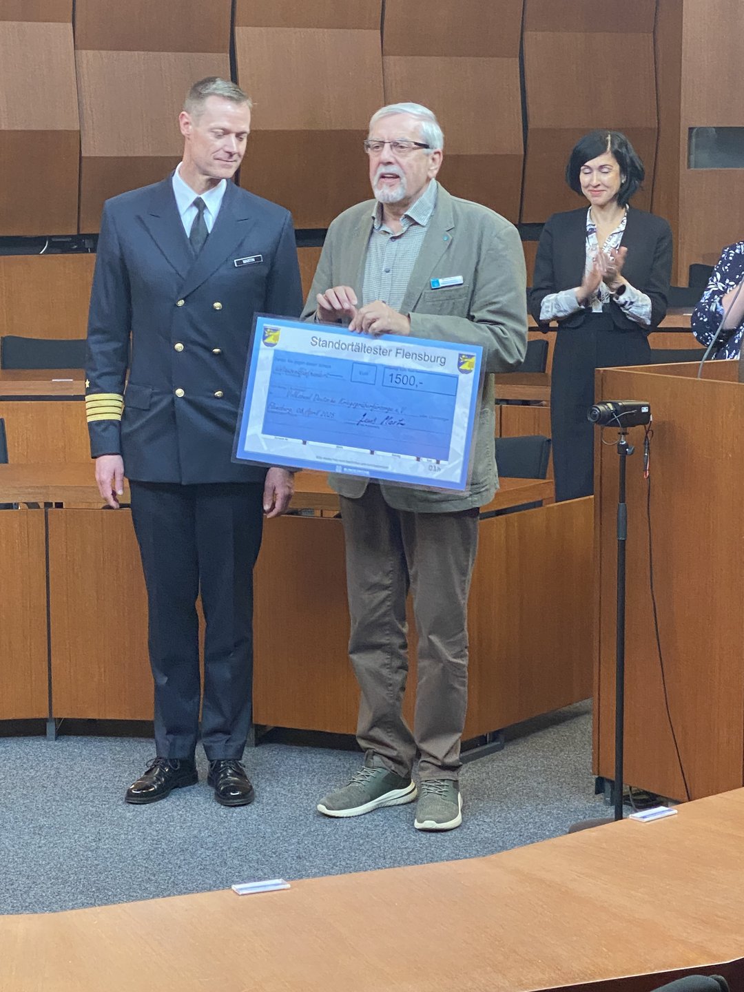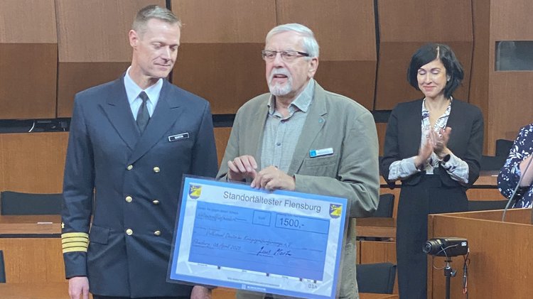 Insgesamt sechs Schecks hatte Martin mit in den Ratssaal gebracht. Neben der Stadt Glücksburg wurden das Spendenparlament, das Soldatenhilfswerk, das Katharinenhospiz und der Volksbund Deutsche Kriegsgräberfürsorge, vertreten durch den Kreisgeschäftsführer Herrn Michael Riedel, bedacht. Der Volksbund erhielt 1500 €.
