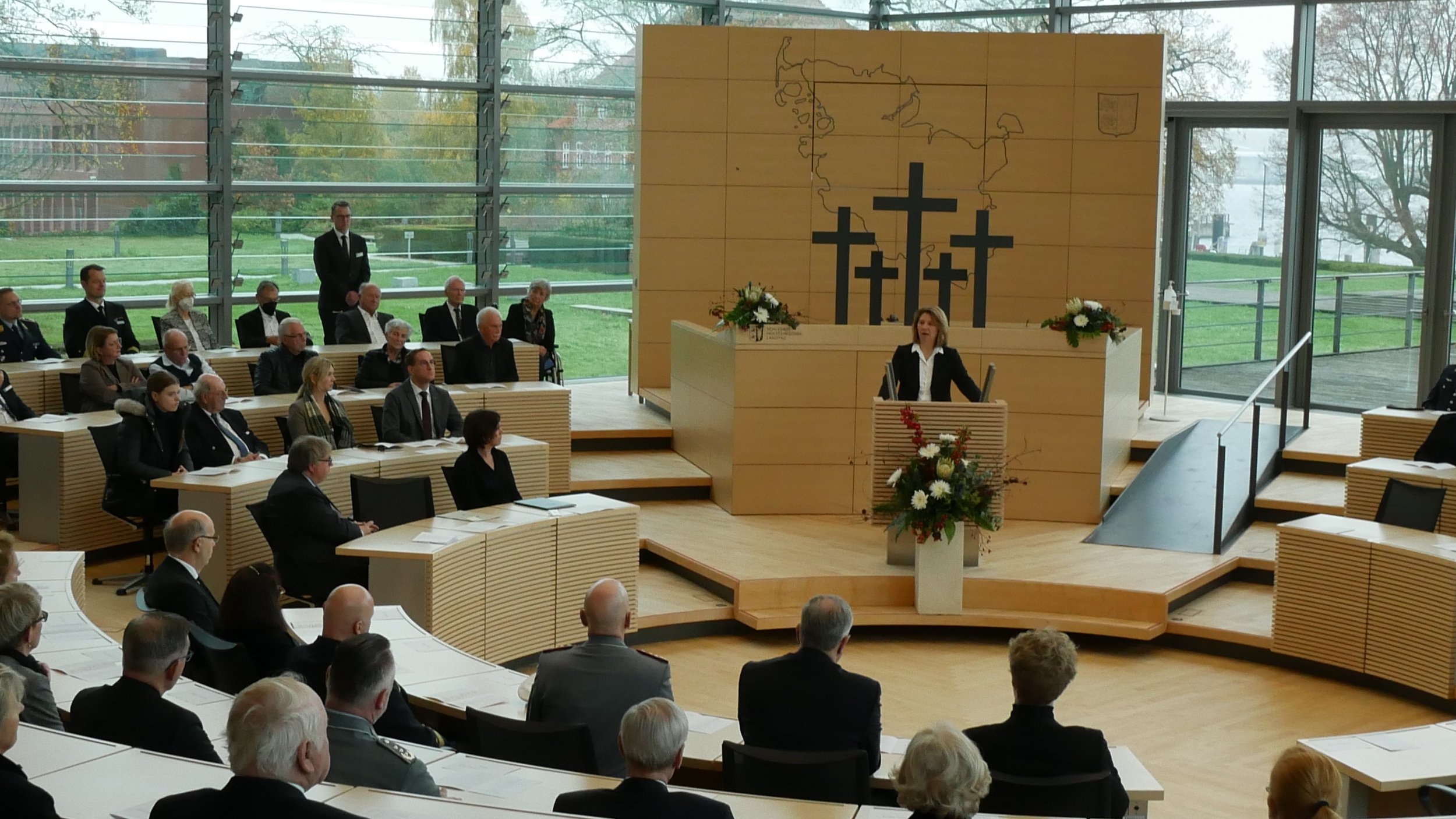 „Mit dem Volkstrauertag geht ein nicht endender Auftrag an Gesellschaft und Politik einher: Niemals zu vergessen und niemals in den Bemühungen um Aussöhnung und Völkerverständigung nachzulassen.“ Mit diesen Worten nahm Landtagspräsidentin Kristina Herbst bei der zentralen Gedenkstunde des Landes zum Volkstrauertag Politik und Gesellschaft in die Pflicht.