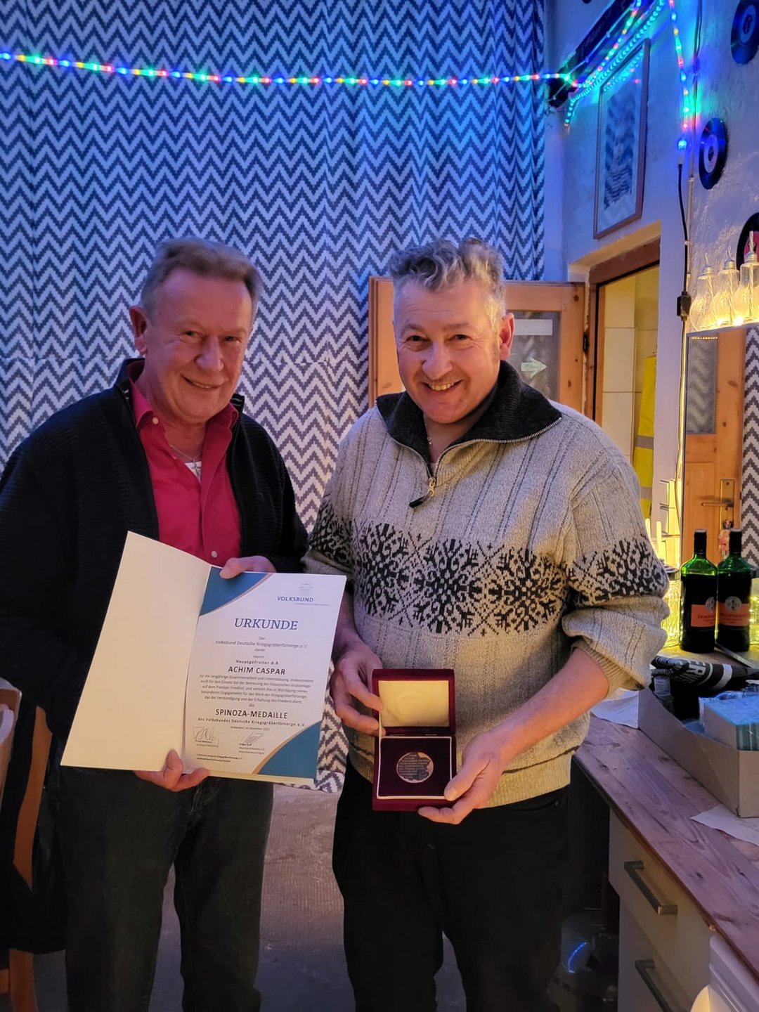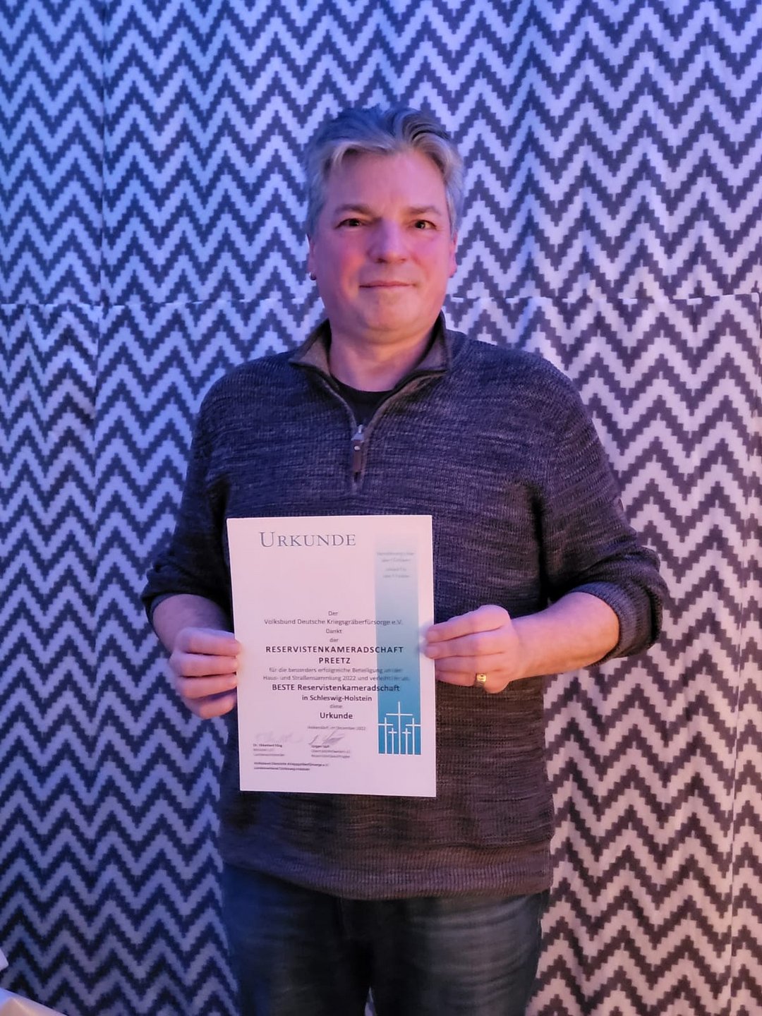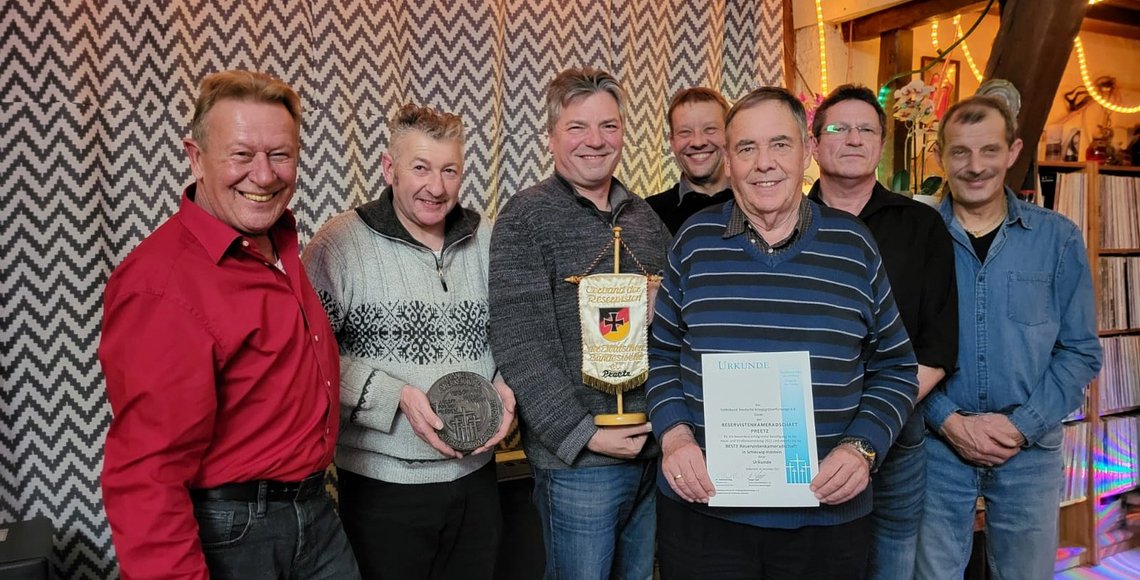 Die jährliche Weihnachtsfeier der Reservistenkameradschaft Preetz war der richtige Rahmen für gleich mehrere Ehrungen. Der Beauftragte des Volksbundes für die Zusammenarbeit mit den Reservisten, Oberstabsfeldwebel a.D. Jürgen Spill, würdigte insbesondere das Engagement der Preetzer Reservisten bei der diesjährigen Haus- und Straßensammlung und überreichte den Sammlern eine Dankurkunde des Landesverbandes.