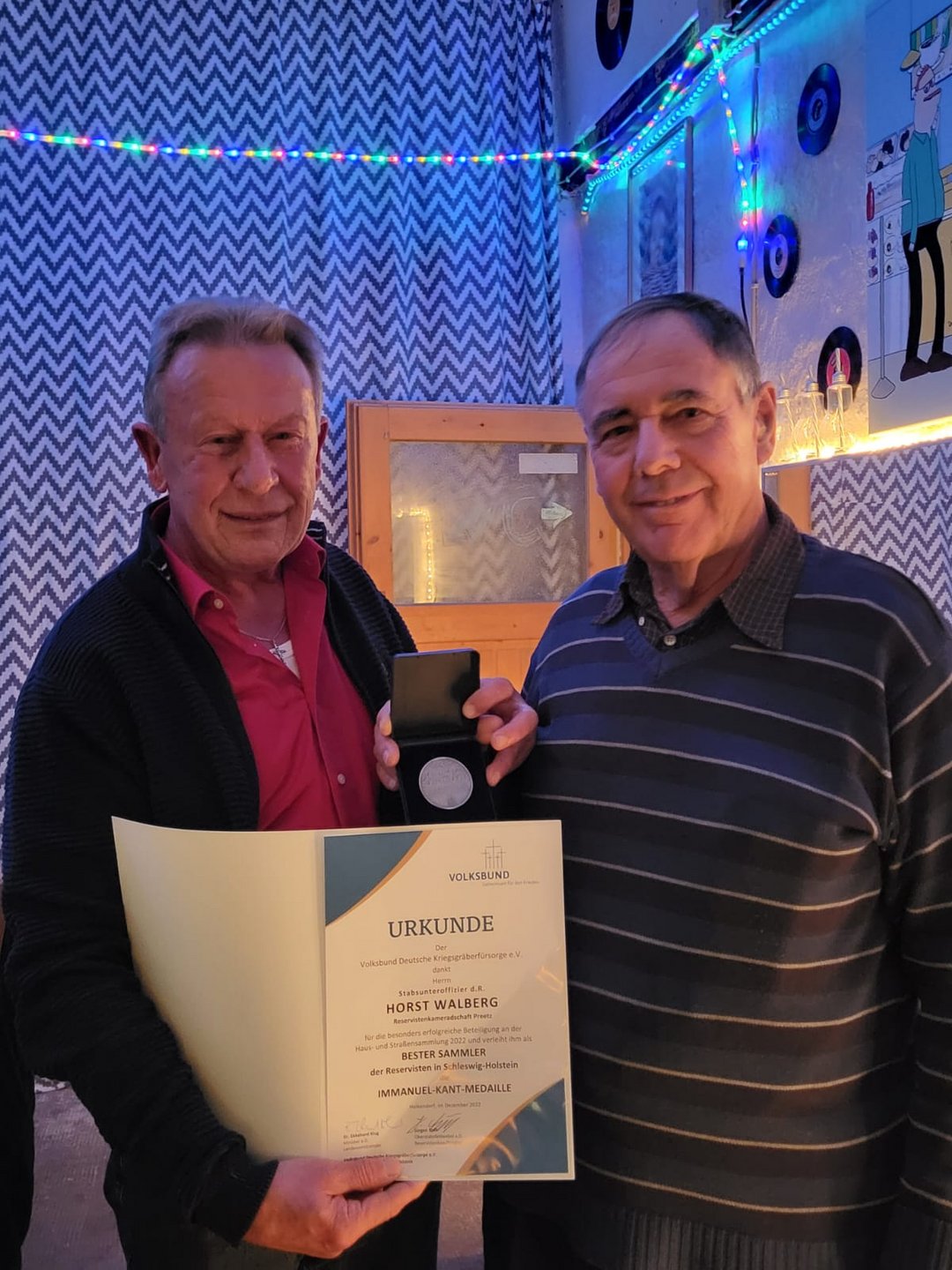Auch der erfolgreichste Einzelsammler der Reservisten in Schleswig-Holstein kommt aus der RK Preetz. Der Stabsunteroffizier d.R. Horst Walberg hatte es sich nicht nehmen lassen, an allen Markttagen im November in Preetz um Spenden zu bitten. So konnte er am Ende der Sammlung drei volle Sammeldosen an den Kreisgeschäftsführer des Volksbundes übergeben. Der Reservistenbeauftragte Jürgen Spill überreichte ihm für diese besondere Leistung die Immanuel-Kant-Medaille.
