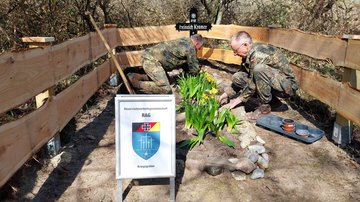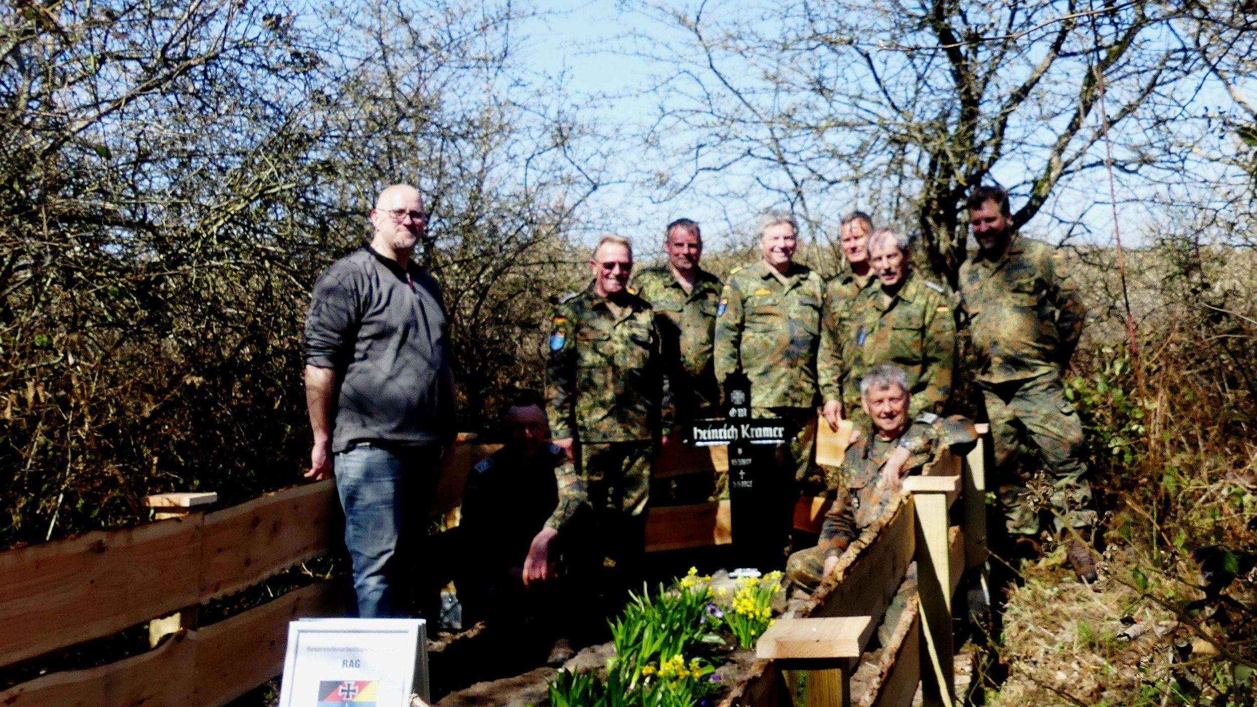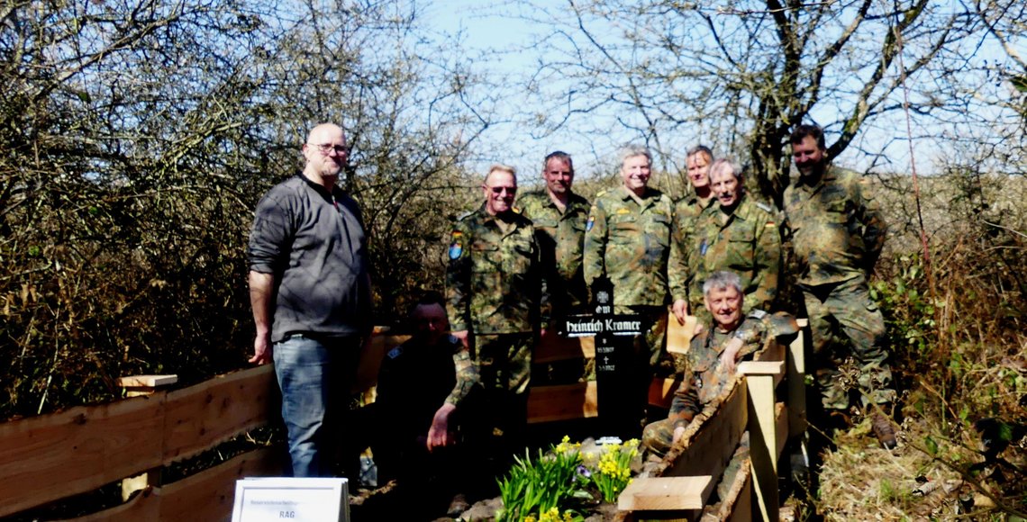 In Weissenau, an der Begräbnisstätte eines Wehrmachtsangehörigen, war der Aufwand deutlich größer! Hier wurde die gesamte Umrandung der Grabstelle erneuert. Der Leitende des Arbeitseinsatzes, Mirco Rahlf, hatte im Vorwege das erforderliche Material herangeschafft, dieses wurde durch die Gemeinde Hansühn bereitgestellt. Insgesamt waren hier neun Mitglieder der RAG-Kriegsgräber im Einsatz. Die Blumenhandlung Andersen aus Oldenburg hat die Bepflanzung für die Grabstelle gespendet.
