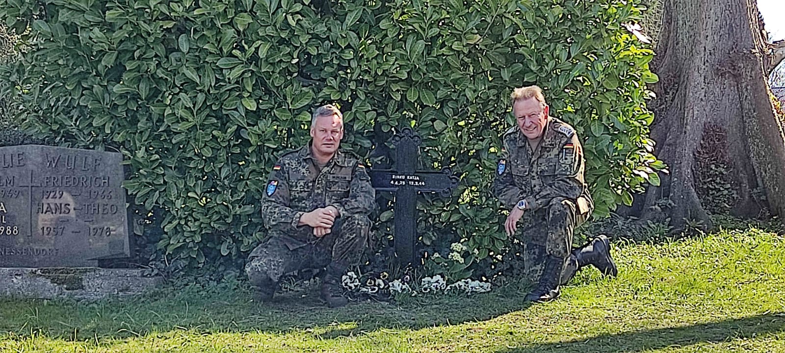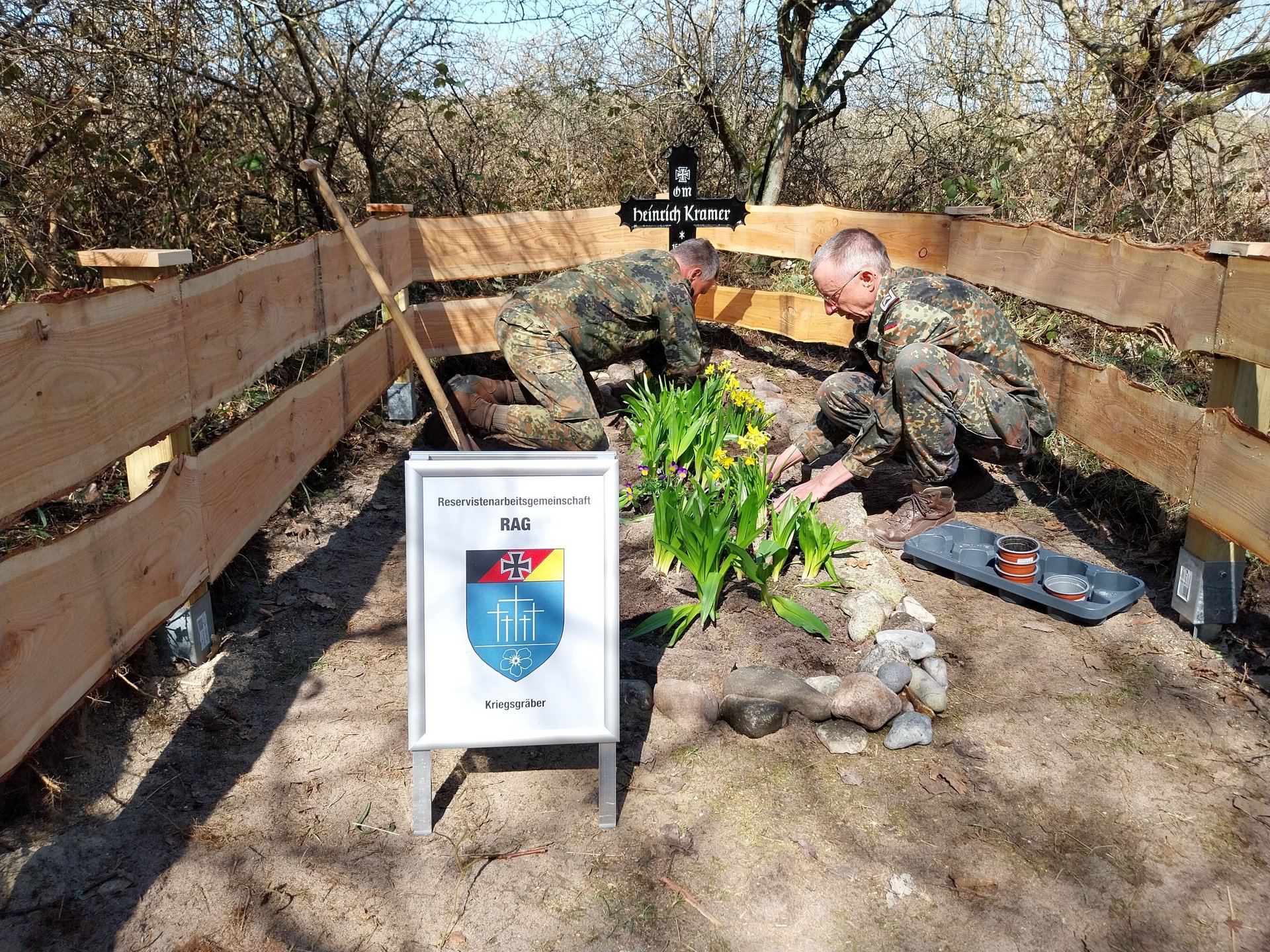 In der Gemeinde Wangels ist die RAG-Kriegsgräber bereits bekannt. In Hansühn haben sie eine Patenschaft für die Kriegsgräber auf dem Gemeindefriedhof übernommen. Am Samstag haben zwei Mitglieder der RAG, der Vorsitzende, Oberstabsfeldwebel a.D. Jürgen Spill und der Stabsunteroffizier d.R. Manuel Mühlhan das Einzelgrab einer Zwangsarbeiterin gereinigt und neu gestrichen. Die Schriftzüge wurden dabei gleich mit erneuert.