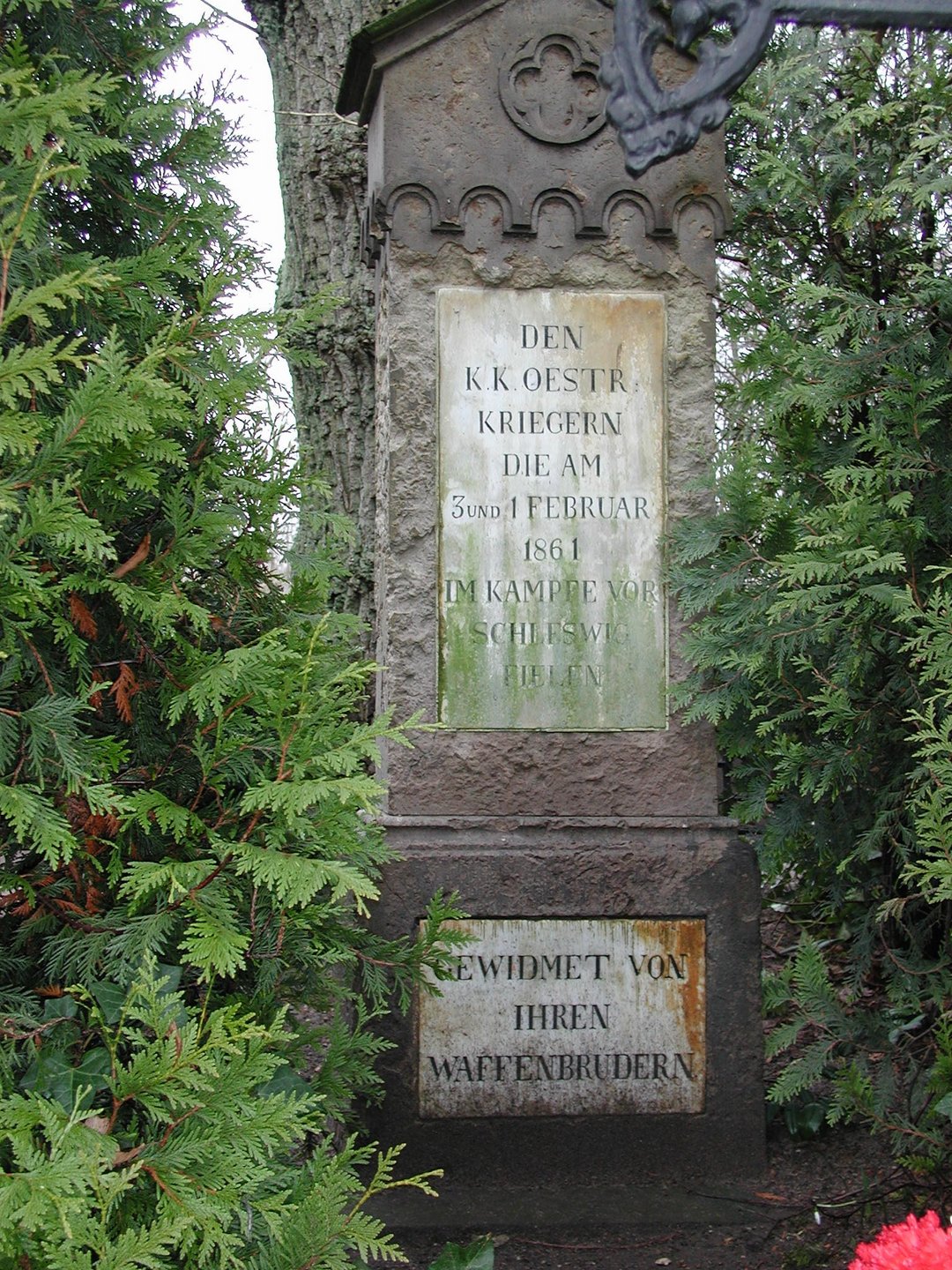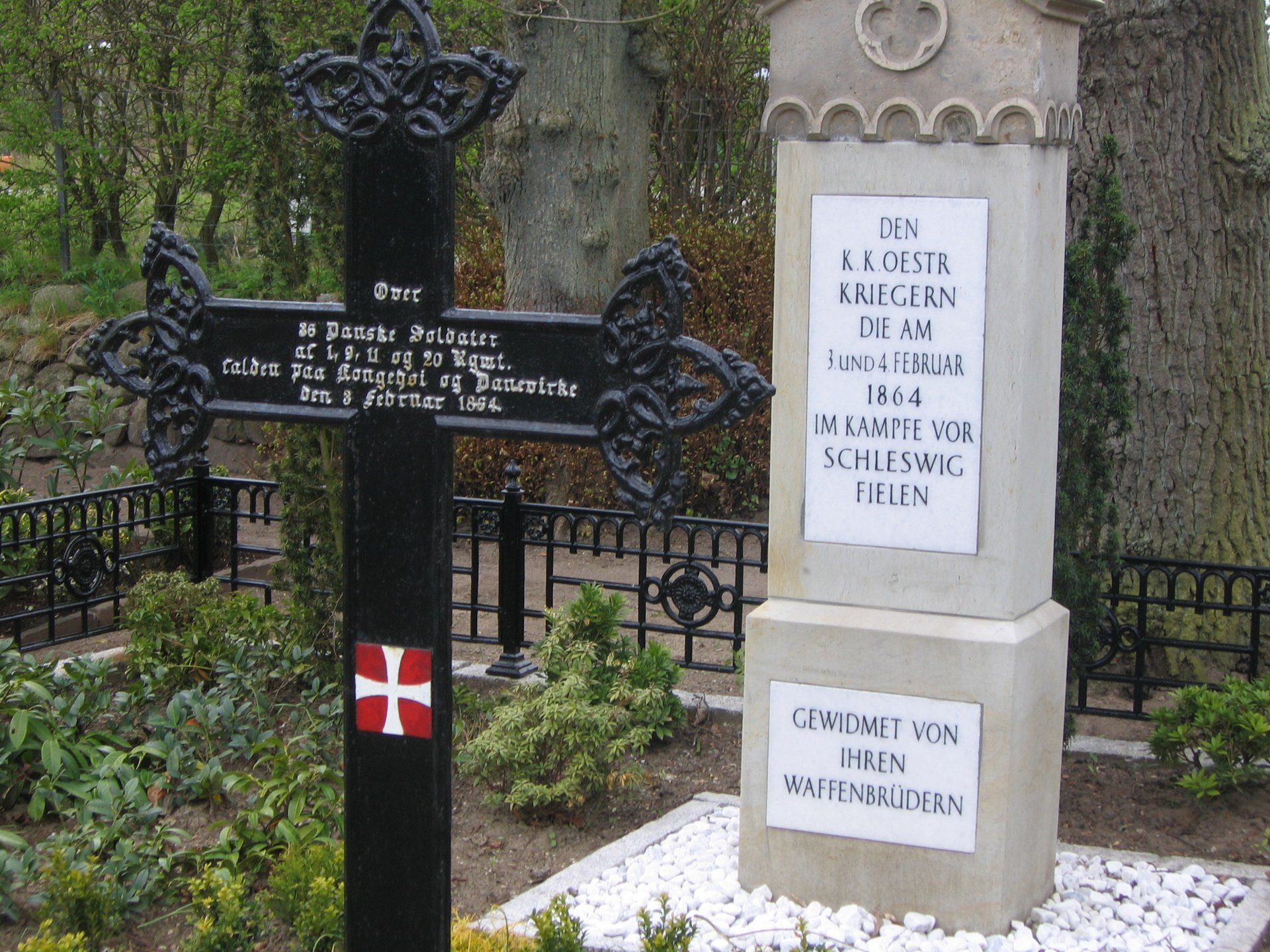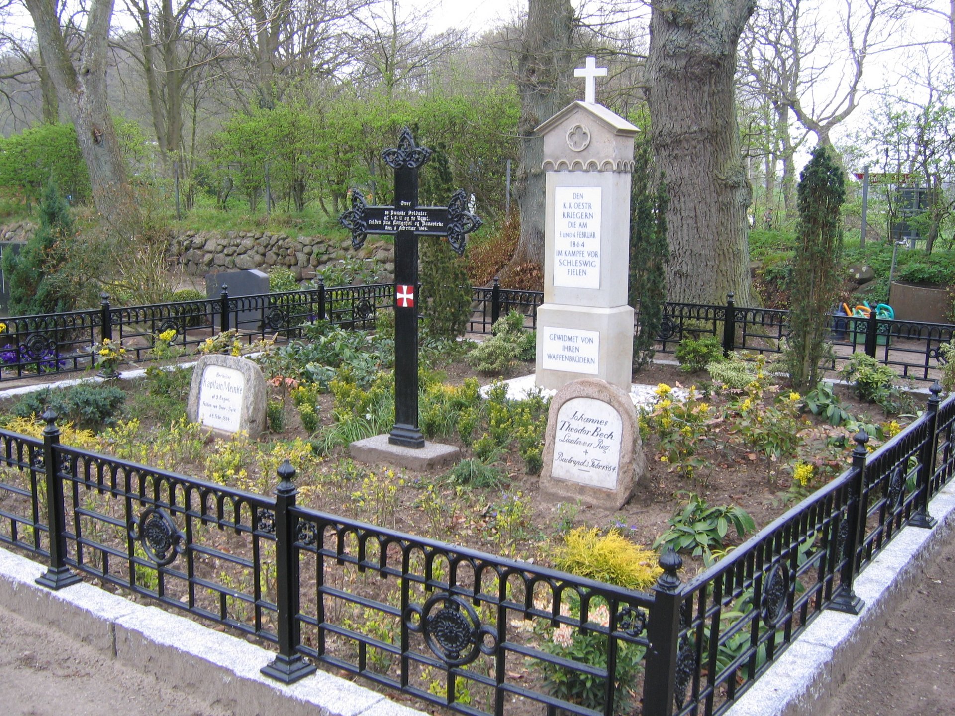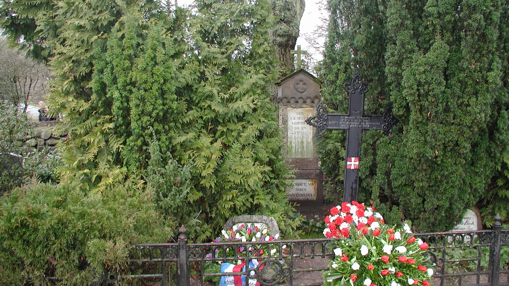 In einer gemeinsamen Grabanlage ruhen hier dänische und österreichische Soldaten, die bei den Kämpfen vor Schleswig am 03./04. Februar 1864 ums Leben kamen. Der österreichische Grabstein war durch falsche Behandlung mit Salzsäure weitgehend zerstört, nur der Kopf des Grabsteins konnte erhalten werden.