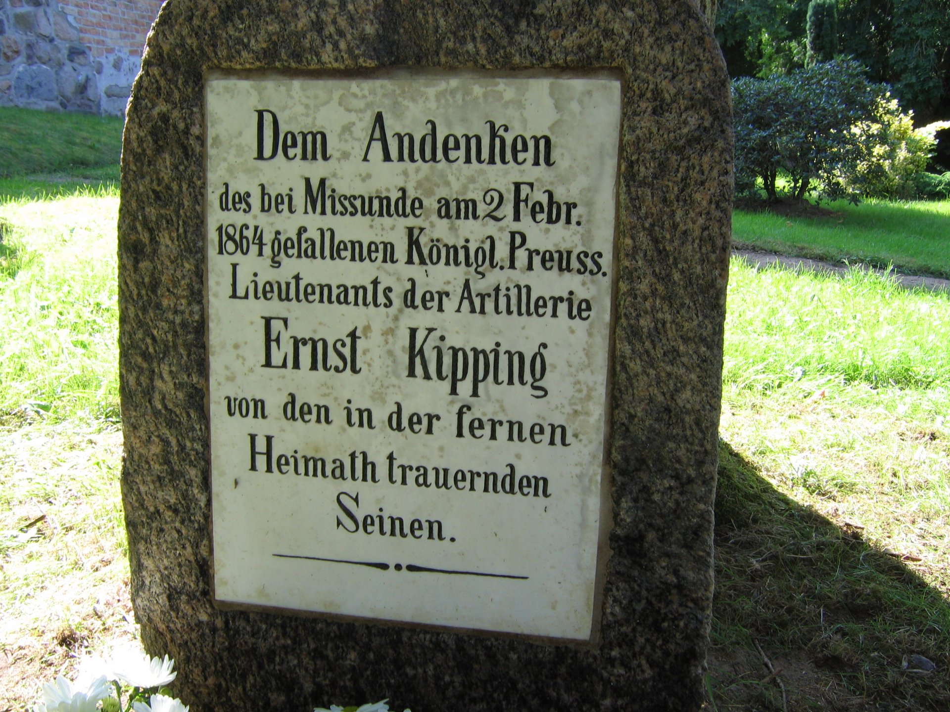 Der Findling, der dem Andenken des am 02.02.1864 bei Missunde gefallenen Leutnants Ernst Kipping gewidmet ist, war im Laufe der Zeit so weit abgesackt, dass die Inschrift nur noch teilweise zu erkennen war.