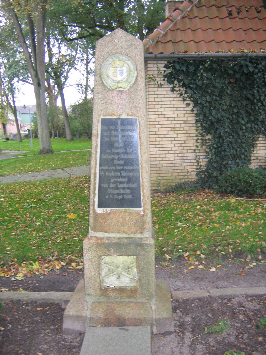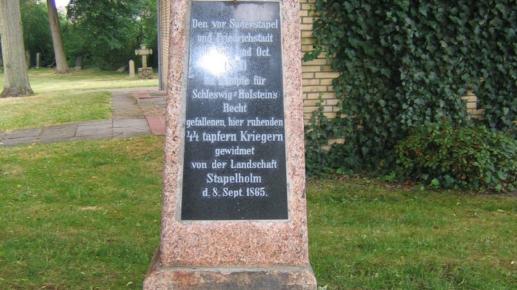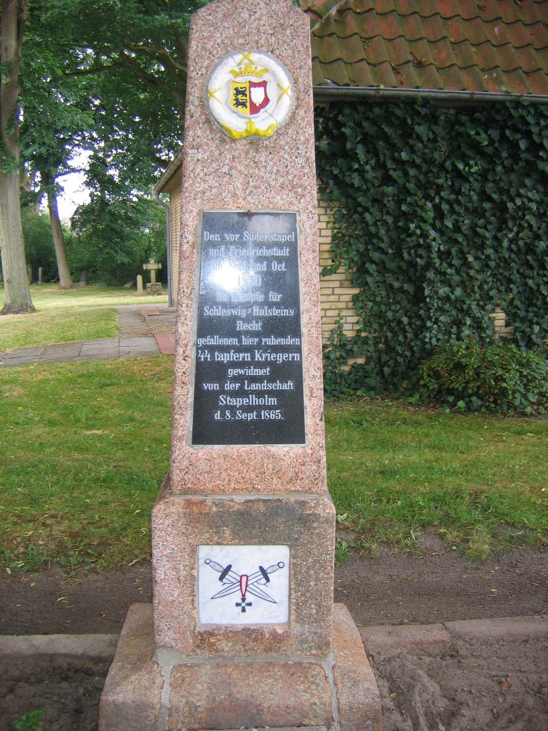 Eine etwa 2,50 m hohe Säule aus Granit mit schwarzer Marmortafel erinnert an 44 Soldaten, nach dem Totenregister der Kirchengemeinde Süderstapel 41 Angehörige der schleswig-holsteinischen Armee und 3 unbekannte Soldaten des dänischen Heeres, die im September und Oktober 1850 vor Süderstapel und Friedrichstadt fielen und hier beigesetzt wurden.