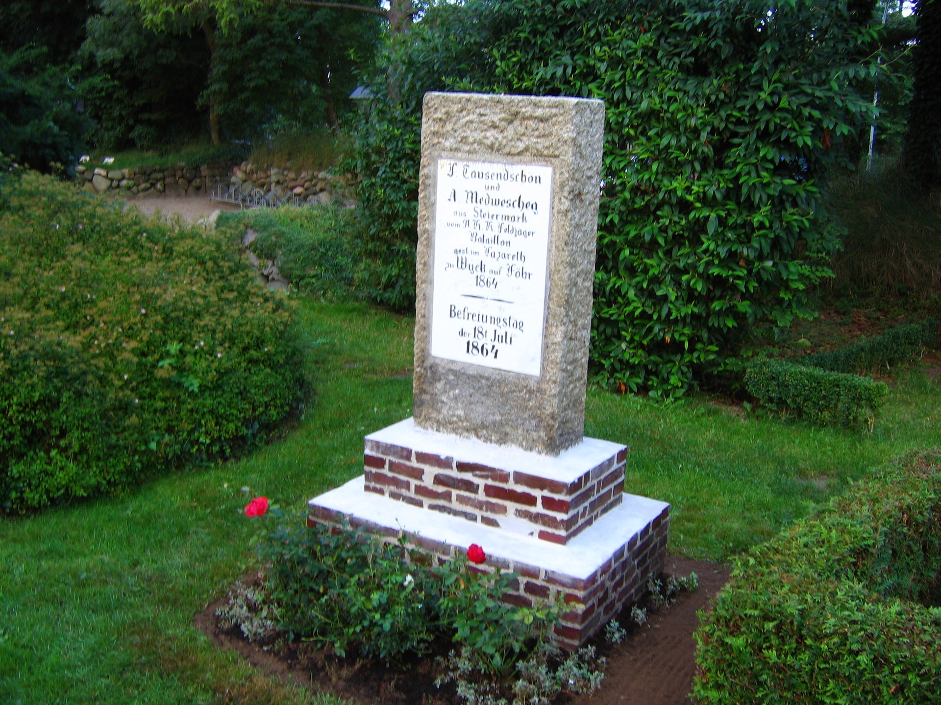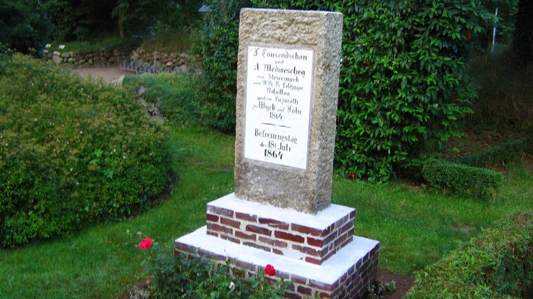 Hier ruhen zwei Soldaten des österreichischen Feldjägerbataillon Nr.9, das am 18.07.1864 an der Einnahme Föhrs beteiligt war. Der Überlieferung nach sollen sich die beiden Soldaten im Streit um ein Föhrer Mädchen gegenseitig verwundet haben und an diesen Verletzungen im Lazarett zu Föhr am 30.07. bzw. 07.08.1864 verstorben sein. Der Grabstein der beiden Soldaten wurde 2005 komplett überarbeitet und so wieder lesbar gemacht. Die alte und unansehnlich gewordene Grabbepflanzung wurde entfernt und das Grab vollständig neu angelegt. Die Pflege hat die Kirchengemeinde Wyk auf Föhr übernommen.